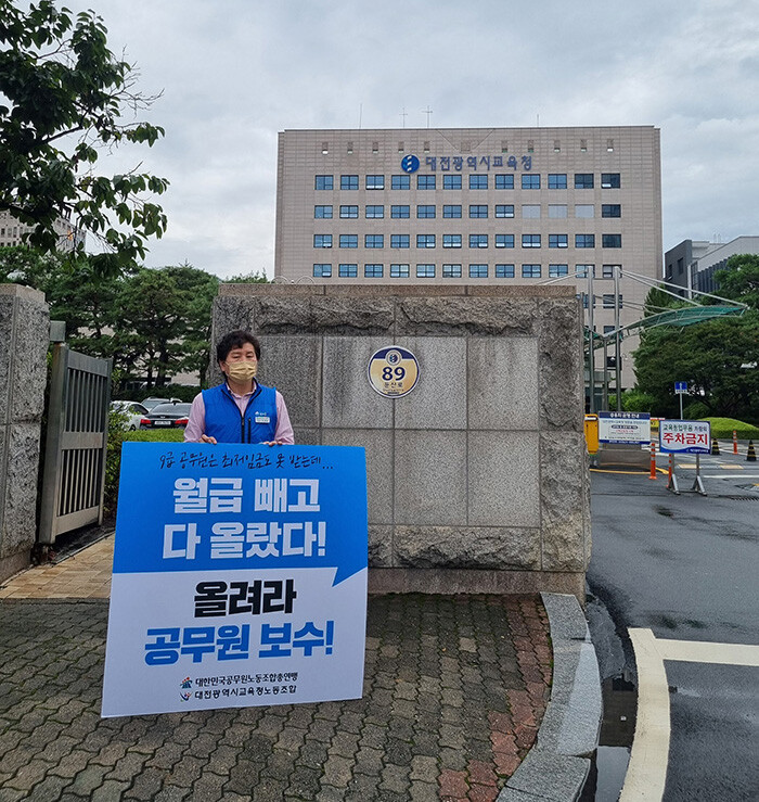 [세계로컬타임즈 민순혜 기자] 대전광역시교육청노동조합(위원장 안종현, 이하 대교노(제2노조))은 1일 대전광역시교육청 앞에서 정부에 2023년도 공무원보수 7.4% 인상과 실질적인 임금교섭 실시를 요구하는 1인 시위를 진행했다.