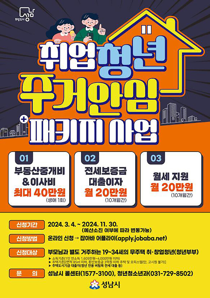 | ▲ ‘취업청년 주거안심 패키지 3종 사업’ 포스터. [자료=성남시] |