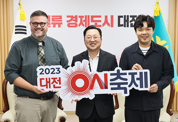 | ▲ 대전시는 1일 플루티스트 ‘김유빈’과 11만 유튜버 ‘오스틴 기븐스’를 대전 홍보대사로 위촉했다.(왼쪽부터 오스틴 기븐스, 이장우 시장, 김유빈) (사진=대전시) |