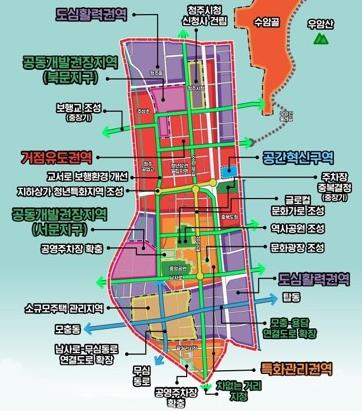 청주시는 2023년 도시계획조례 개정으로 원도심의 경관지구를 폐지하고 2024년 9월까지 지구단위계획을 수립, 고도 제한을 완화했다. 이에 따라 원도심 내 용적률은 130%까지, 높이제한은 130m까지 확대돼 고밀복합개발이 가능해다.