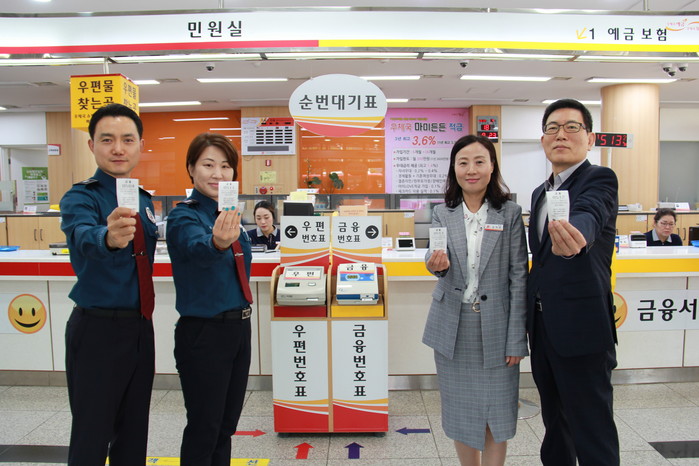 | ▲ 대구강북경찰서와 북대구우체국은 보이스피싱 예방문구 기재한 번호표를 선보이고 있다. (사진=대구강북경찰서 제공) |