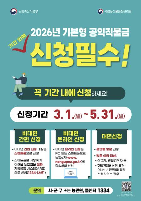 권영란 농업정책과장은 “대상 농가는 자격요건과 준수사항을 충분히 숙지해 기한 내 신청해 주시길 바란다”고 당부했다.