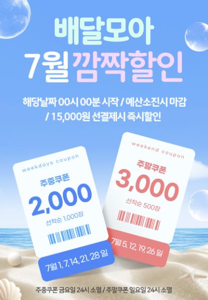 이벤트는 7월 1일부터 제천시 배달모아 이용자에게 선착순으로 주중 1,000명에게 2,000원 할인쿠폰을 주말에는 500명에게 3,000원 쿠폰을 지급한다.