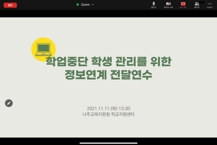 전달 연수는 '2021 학업중단 숙려제·정보연계·대안교육 위탁교육 길라잡이' 책자를 중심으로 △학업중단숙려제 운영 △학업중단숙려제 나이스(NEIS) 업무지원 △학업중단숙려제Q&A △학업중단학생 정보연계 △학업중단업무 Q&A △대안교육 위탁교육 참고 자료 순으로 설명되어 대상 학생 관리를위한 실질적인 도움을 제공했다.