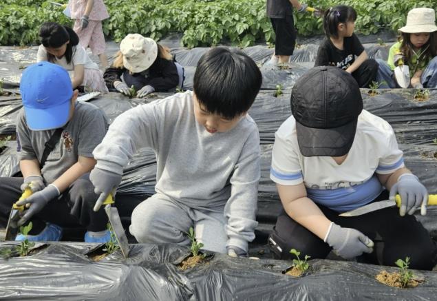 이날 체험에는 신현동 주민자치회와 포리초등학교 1, 2학년 학생들이 참여했다. 아이들은 지난 4월 포리초에서 직접 파종한 모종들을 친구들과 함께 심고 흙을 주무르며 자연을 만나는 시간을 가졌다.