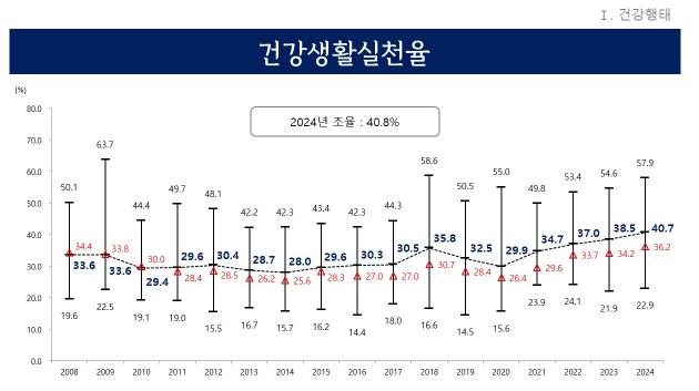 먼저 금연, 절주, 걷기 모두를 실천한 복합지표인 ‘건강생활실천율’이 전국 중앙값 36.2%보다 4.5% 높은 40.7%로 나타났다. 이는 지역사회건강조사를 실시한 2008년 이후 역대 최고치다. 경기도의 건강생활실천율은 2014년 28%로 낮아졌다가 2023년 38.5%로 최고치를 기록한 이후 1년 만에 다시 갱신했다. 시군별로는 과천시 57.9%, 성남시 분당구 56.5%, 용인시 수지구 54.7% 순으로 높은 수치를 나타냈다.