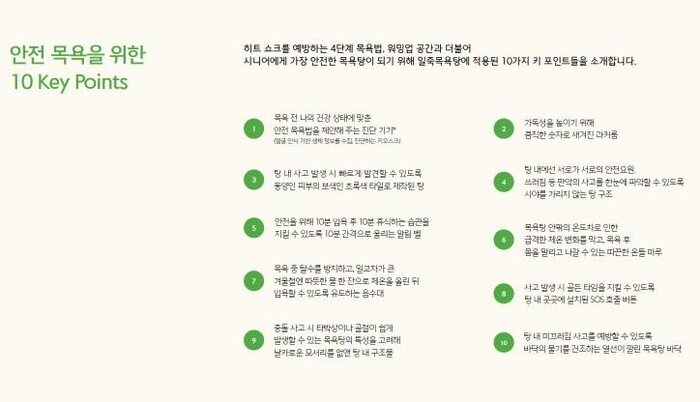 탕 안에는 날카로운 모서리를 없애고, 비상 상황에 대비한 SOS 호출 버튼을 곳곳에 설치했다. 또한 고령자 편의를 고려해 라커룸 숫자를 크게 표기하고, 목욕탕 내부 벽면을 인체 색과 대비되는 색상으로 꾸몄다.