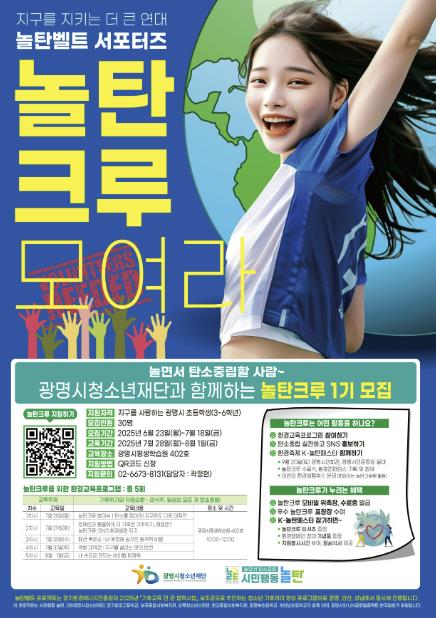 놀탄크루는 ▲환경교육프로그램 참여 ▲탄소중립 실천 및 SNS 홍보▲K-놀탄페스타 기획 및 운영 등의 미션을 수행한다. 광명시청소년재단과 함께하는 놀탄크루 환경교육은 7월 28일(월)부터 8월 1일(금)까지(오전 10시~12시) 광명시평생학습원 402호에서 진행될 예정이다.