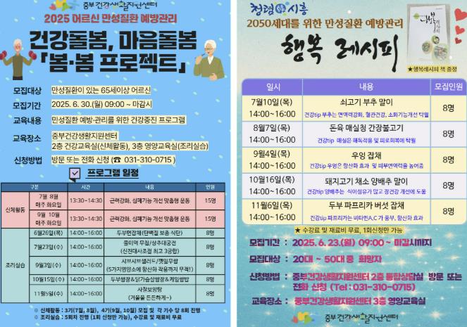 65세 이상 어르신 대상 ‘봄ㆍ봄 프로젝트’는 근력 강화와 심폐기능 향상을 위한 신체활동(7~10월, 주 1회)과, 만성질환 예방을 위한 조리실습(6월~11월, 월 1회)으로 구성된다. 20~50대 성인을 위한 ‘행복 레시피’는 건강 식재료를 활용한 요리실습 프로그램으로, 7월~11월 중 월 1회 총 5회 운영된다. 교육은 중부건강생활지원센터 2층 건강교육실(신체활동)과 3층 영양교육실(조리실습)에서 진행된다.