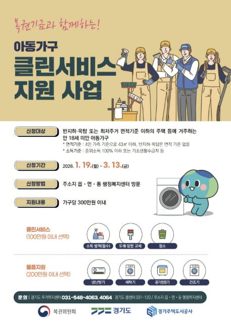 아동주거빈곤가구 클린서비스는 저소득 아동가구의 주거환경과 위생 개선을 위한 소독·방역, 도배장판 교체, 청소, 수납정리 등 ‘클린서비스’와 냉난방기, 공기청정기, 세탁기, 건조기 등 ‘물품’을 지원하는 사업이다. 시는 본 사업을 통해 아동 친화적 주거복지를 실현하고, 주거 취약 아동가구 삶의 질 향상을 도모할 계획이다.