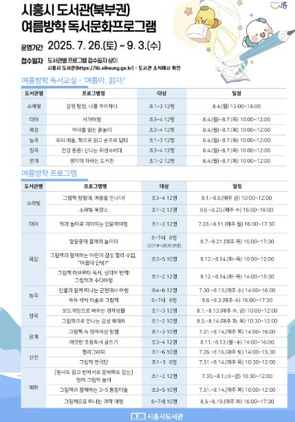 여름독서교실 외에도 여름방학 기간에 각 도서관에서는 책을 기반으로 한 프로그램이 함께 운영된다. 대표 프로그램으로는 ‘그림책 탐험대, 여름을 만나다!’(소래빛), 책과 놀이로 이어지는 인문학여행(대야), 말랑콩떡 클레이 놀이터(목감) 등이 있으며, 아이들이 도서관을 자연스럽게 접하며 독서를 친근하게 느끼고 창의력을 키울 수 있도록 구성됐다.