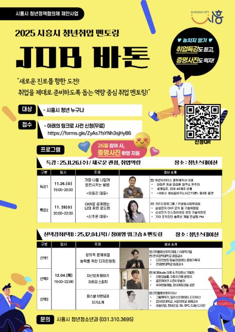 ‘잡바톤’은 시흥시 청년정책협의체 창업ㆍ일자리분과에서 제안한 사업으로, 취업 준비 과정에서 청년들이 겪는 어려움을 해결하기 위해 마련됐다. 프로그램은 ▲자기 강점 탐색 ▲직무별 멘토링 ▲자기표현력 향상을 위한 첨삭 지도 ▲기업 문화 이해도 향상 ▲직무 인터뷰 실습 등 단계별로 전문 멘토의 밀착 피드백을 제공한다. 특히 11월 26일 특강 참석자에게는 취업 준비에 필수적인 ▲증명사진 촬영 지원도 제공된다.