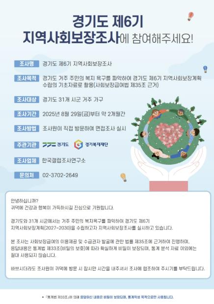 이번 조사는 경기복지재단과 한국갤럽연구소가 전문적으로 진행한다. 조사원들이 직접 가구를 방문해 일대일 인터뷰 방식으로 진행하며, 조사 대상자로 선정되면 유선 안내가 이뤄지며, 참여 가구에는 온누리 상품권 5천 원권 1매가 지급된다.