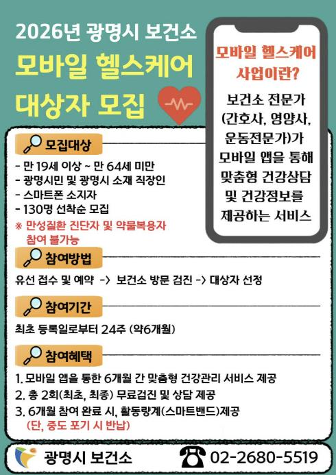 모집 대상은 스마트폰을 사용할 수 있는 만 19세 이상 64세 미만의 광명시민이나 광명시 소재 직장인이다. 단, 고혈압·당뇨병 등 만성질환을 진단받았거나 약물 치료 중인 경우는 제외된다.
