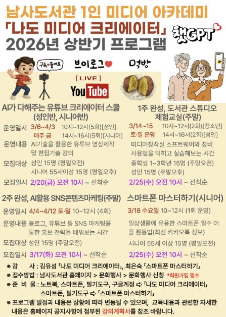 프로그램은 ▲초등 유튜브 크리에이터 방학캠프 ▲1주 완성, 도서관 스튜디오 체험교실(청소년·성인) ▲2주 완성, 인공지능(AI) 활용 사회관계망서비스(SNS) 콘텐츠 마케팅 ▲AI가 다해주는 유튜브 크리에이터 스쿨(성인·시니어) ▲스마트폰 마스터하기 등이다.