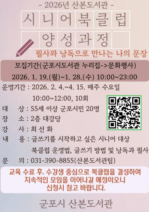 산본도서관에서 2025년도에 ‘낭독과 필사로 떠나는 글쓰기 여행’ 수업을 맡았던 최선화 강사가 진행하며 도서관은 교육 기간 중, 신규 시니어 독서동아리를 모집 및 결성하여 지속적인 독서 모임 활동을 지원할 계획이다.