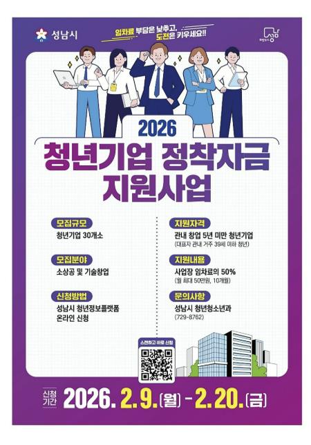 신청 대상은 19~39세의 성남시민이면서 공고일(2.9) 기준 지역 내에 창업한 지 5년 미만인 기업 대표다.