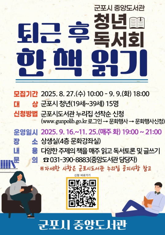 청년독서회는 19세부터 39세까지의 군포시 청년을 대상으로 하며, 매주 화요일 저녁 7시부터 9시까지 중앙도서관 문화강좌실에서 운영된다. 특히 학생, 직장인 등 낮 시간대 도서관 이용이 어려운 청년층의 실질적 참여를 고려해 퇴근 후 시간대에 맞춰 진행한다.