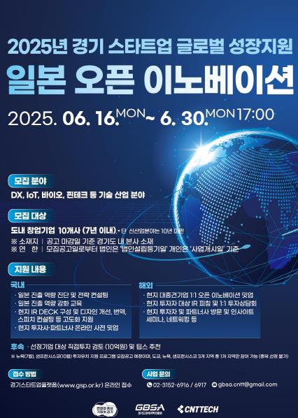 대상은 경기도에 본사를 둔 창업 7년 이내 스타트업이며, 신산업 분야 기업은 최대 10년 이내까지 가능하다. 디지털 전환(DX), 사물인터넷(IoT), 바이오, 핀테크 등 기술 산업 분야의 유망 기업 10개사를 서류 및 발표평가를 통해 선정할 예정이다.