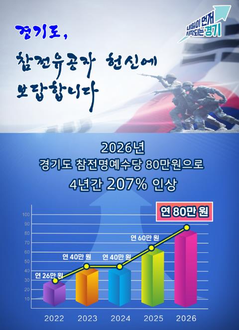 민선 8기 경기도는 ‘나라를 위한 특별한 희생에는 반드시 합당한 예우가 뒤따라야 한다’라는 인식 속에서 2022년 26만 원에서 2023년 40만 원, 2025년 60만 원, 2026년 80만 원 등 꾸준히 지원액을 높였다.