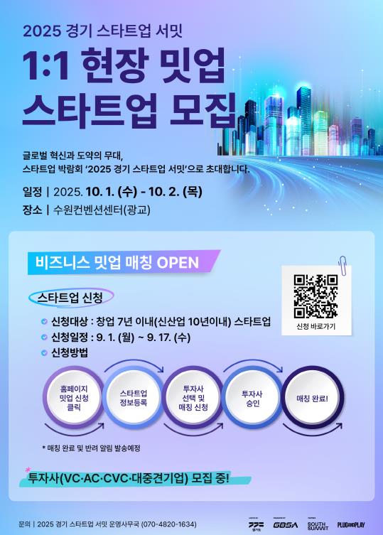 ‘2025 경기 스타트업 서밋’ 1:1 현장 밋업에 참여를 원하는 스타트업은 오는 17일까지 공식 누리집에서 신청할 수 있다. 또한 현장을 참관하고자 하는 일반 참가자와 스타트업 관계자는 30일까지 사전등록을 통해 무료 입장 신청이 가능하다.