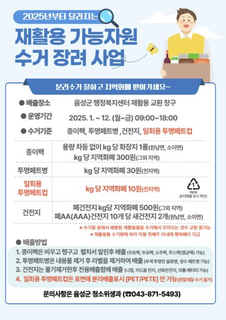 군에 따르면, 지난 1월부터 주민들에게 쓰레기 분리배출의 필요성을 알리고, 재활용률 증가와 주민 참여 확대를 위해 기존 물품 교환 방식에서 현금(음성행복페이) 지급 방식으로 전환, 투명 페트병을 시작으로 수거장려제를 운영해 왔다.