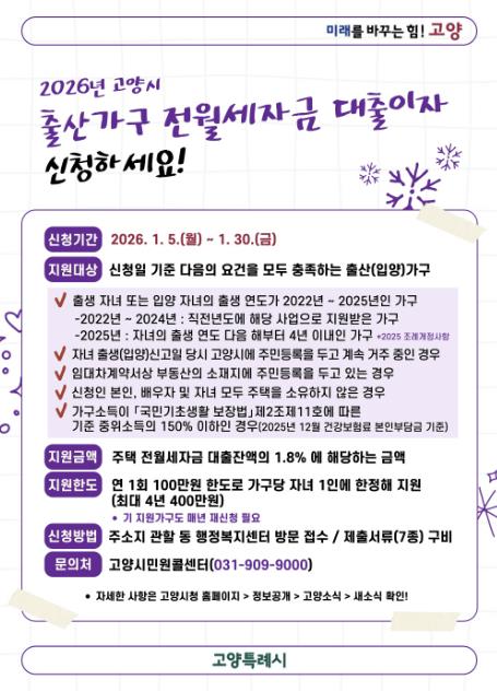 또한 출산의 가치를 존중하는 고양시만의 특화 사업도 지속 추진한다. 모든 출산 가정에 국산쌀로 만든 ‘탄생축하 쌀케이크’를 지원하고, 셋째 자녀 이상 출산 가정에는 오가닉 천으로 제작한 수제 아기용품 ‘다복꾸러미’를 제공한다.