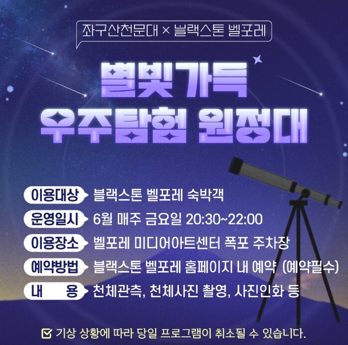 벨포레 폭포주차장에서 오후 8시 30분부터 10시까지, 일상에선 경험하기 어려운 천체관측과 천체사진 촬영, 인화까지 특별한 밤하늘 체험이 펼쳐진다.
