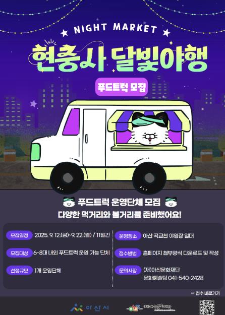(재)아산문화재단 관계자는 “이번 푸드트럭 운영단체 모집은 관내 업체가 함께 참여하여 현충사 달빛야행을 찾는 시민에게 다채로운 먹거리 경험을 제공하고자 하는 취지”라며 “많은 관심과 참여를 바란다”고 전했다.