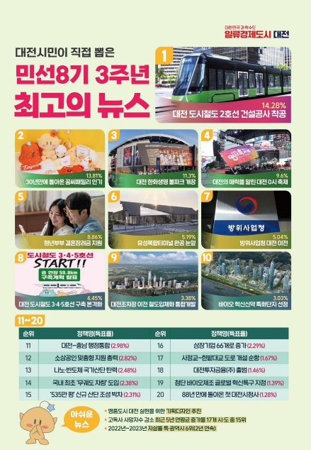이 밖에도 ▲결혼하고 싶은 도시 대전, 청년 부부 결혼장려금 지원(5위) ▲새로운 대중교통 환승 거점, 15년 시민 숙원 유성복합터미널 눈앞(6위) ▲K-방산수도 대전 시대 개막, 방위사업청 대전 이전(7위) ▲대전 도시철도망을 더욱 촘촘하게, 3‧4‧5호선 구축 본격화(8위) ▲대전조차장 이전 철도입체화 통합개발, 국가선도사업 선정(9위) ▲세계적인 바이오 허브 도약 발판, 바이오 특화단지 선정(10위) 등이 시민들로부터 높은 관심을 받았다.