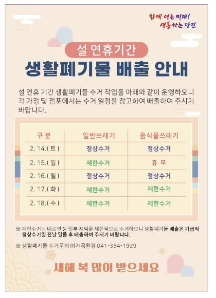 2월 14일과 16일은 일반쓰레기와 음식물쓰레기를 모두 정상 수거하며, 2월 15일에는 일반쓰레기는 제한 수거하고 음식물쓰레기 수거는 중단한다.