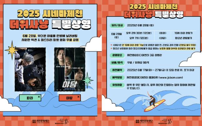 제천문화재단 관계자는 “무더위에 지친 시민들이 짜릿한 액션 영화로 잠시나마 시원한 휴식을 즐기시길 바란다”며 “앞으로도 다양한 장르의 영화를 무료로 상영해 제천 시민들의 문화적 갈증을 해소할 수 있도록 꾸준히 노력하겠다”고 전했다.