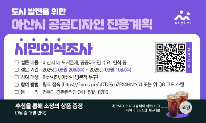 이번 조사는 공공디자인 정책에 대한 인식과 요구를 폭넓게 파악해 생활 속 디자인 개선과 정책 수립에 반영하기 위해 마련됐다. 아산 시민은 물론 방문객 누구나 참여할 수 있다.