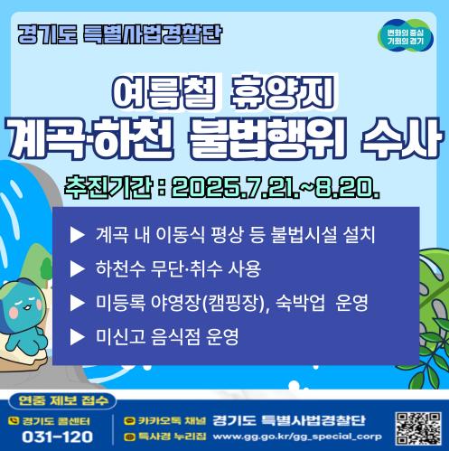 [세계로컬타임즈] 여름 휴가철을 맞아 경기도가 7월 21일부터 8월 20일까지 도내 주요 계곡과 하천 등 휴양지에서 발생하는 불법행위를 집중 단속한다.