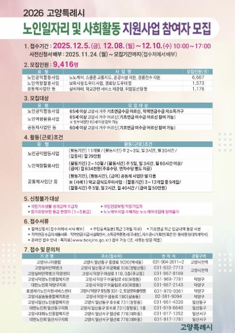 오는 11월 24일부터 고양시 노인일자리 수행기관 10개소에서 신청서를 배부하고, 12월 5일~12월 10일 중 지정된 날짜에 방문 또는 온라인 접수할 수 있다.