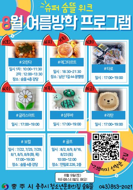 특히 8월 첫째 주는 ‘슈퍼 숨뜰 위크’로 정하며 △글라스아트 배우기 △샴푸바 만들기 △라탄 공예 △타로 배우기 일일 강좌가 진행된다.