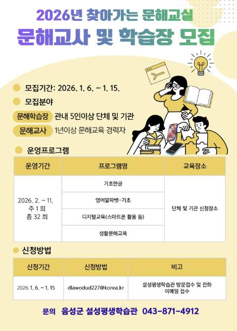 모집 기간은 이달 15일까지로, 설성평생학습관 방문 또는 전화, 이메일 접수를 통해 지원할 수 있다.