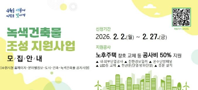 [세계로컬타임즈] 수원특례시가 2월 2일부터 27일까지 ‘2026년 녹색건축물 조성 지원사업’ 신청을 받는다.