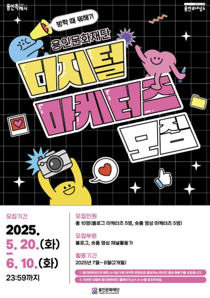 ‘디지털 마케터즈’는 재단의 공연, 전시 등 다양한 문화예술 사업을 직접 체험하고 취재해 SNS 콘텐츠를 제작, 대중과 소통하는 시민 참여형 홍보단이다. 모집 인원은 총 10명(블로그 마케터즈 5명, 숏폼 영상 마케터즈 5명)이며, 활동 기간은 2025년 7월부터 8월까지 두 달간이다. 대상은 용인특례시에 거주하거나 용인 소재 대학(원)에 재학 중인 자로, 블로그·유튜브·인스타그램 등 소셜미디어 운영 경험이 있는 지원자를 우선 선발한다.