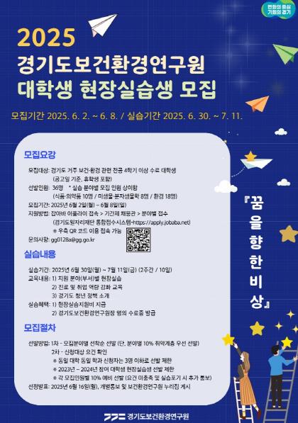 지원 자격은 경기도에 거주하며 보건 또는 환경 관련 학과에서 4학기 이상 이수한 대학생 및 휴학생이다. 모집 규모는 식품·의약품(10명), 미생물·분자생물학(8명), 환경(18명) 등 총 36명으로, 신청자 가운데 취약계층 학생을 우선 선발한다. 2023년 또는 2024년 참가자는 이번 모집에서 제외된다.