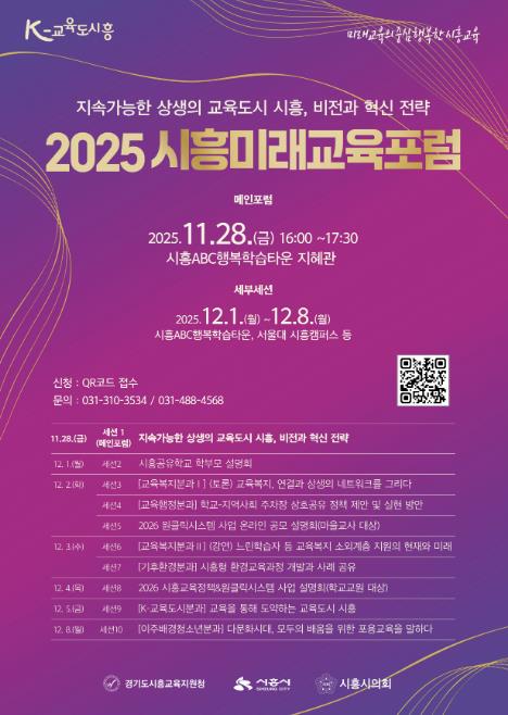 세부 세션은 12월 1일부터 8일까지 이어지며, ▲교육복지분과(교육복지 통합지원 네트워크 추진 방안 / 느린학습자 등 교육복지 소외계층 지원의 현재와 미래) ▲교육행정분과(학교-지역사회 주차장 상호공유 정책 제안 및 실현 방안) ▲기후환경분과(시흥형 환경교육과정 개발과 사례) ▲K-교육도시분과(교육을 통해 도약하는 교육도시 방안) ▲이주배경청소년분과(다문화시대, 모두의 배움을 위한 포용교육 방안) 등 5개 분과로 운영된다. 또한 ‘시흥공유학교 학부모 설명회’와 ‘2026 시흥교육정책 및 원클릭시스템 사업설명회’ 등 연계 세션도 함께 진행된다.