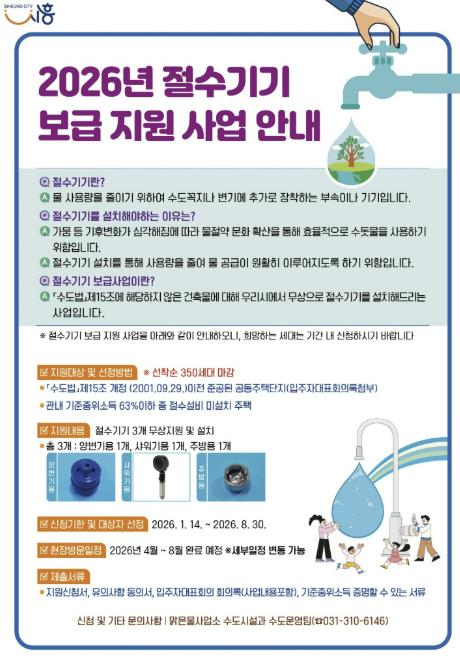 [세계로컬타임즈] 시흥시는 물 절약 문화를 확산하기 위해 ‘2026년 절수기기 보급 지원사업’을 본격적으로 추진한다. 올해는 작년보다 지원 대상을 넓혀 관내 저소득 취약계층까지 총 350세대에 가구당 절수기기 3종(양변기용ㆍ주방용ㆍ샤워기용)을 무상으로 지원한다.