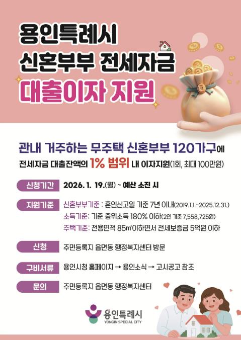 지원 대상은 용인특례시 시민 중 2019년 1월 1일부터 2025년 12월 31일 사이 혼인신고한 신혼 부부다. 2인 가구 기준 월 소득 755만원 이하, 전용면적 85㎡ 이하 전세보증금 5억원 이하의 주택(아파트, 단독주택, 다가구주택 등) 전세자금을 대출 받은 무주택자 요건을 갖춰야 한다.