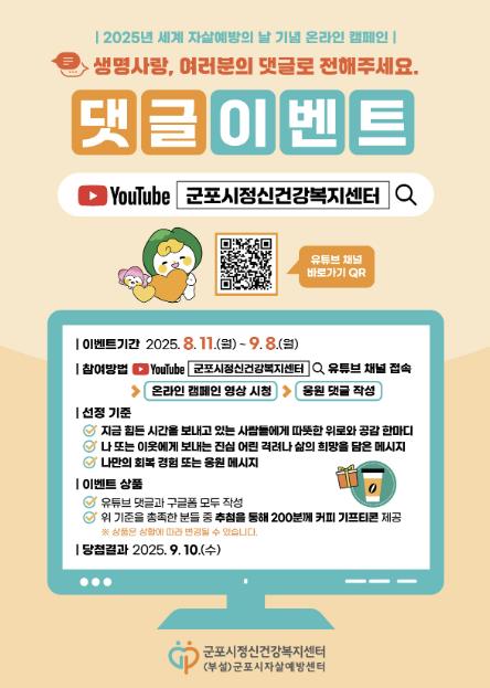 군포시자살예방센터 관계자는 “이번 캠페인을 통해 시민들이 생명존중에 대해 한 번 더 생각하고, 댓글이라는 작은 실천으로도 자살예방에 동참할 수 있다는 메시지를 전달하고자 한다”며 “정신건강에 어려움을 겪고 있다면 망설이지 말고 가까운 정신건강전문기관의 도움을 받아주시길 바란다”고 전했다.