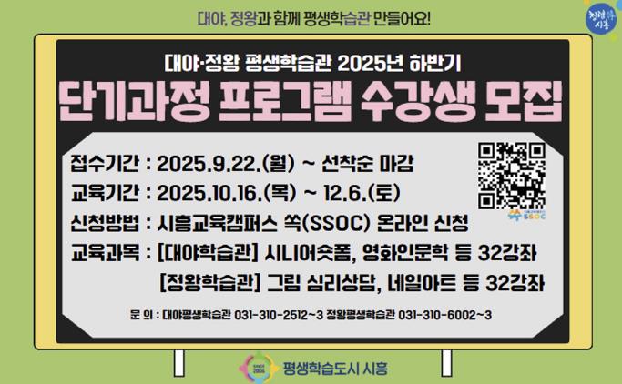 평생학습관 단기과정 프로그램은 2주~6주 과정과, 원데이클래스로 운영되며, 청년· 직장인·남성 수강생을 위한 주말·야간 시간대 강좌를 확대 운영해 평생학습 프로그램의 참여기회를 넓힌다. 대야·정왕 평생학습관에서는 지역 유휴공간 활용 및 지역특화를 반영한 평생학습 프로그램이 제공되며, 평생학습 활성화를 위해 단기과정 및 원데이클래스 강좌에 대하여 수강료는 무료로 운영된다.