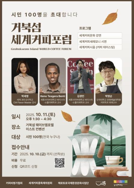 이번 포럼에는 국내외 커피 전문가들이 함께한다. 박세영 세계3대 요리학교 CIA 플레이버 마스터 강사, 세종사이버대학교 바리스타ㆍ소믈리에학과 Keno Tesgera Bentiㆍ김경민 교수, 박영순 세종사이버대학교 바리스타ㆍ소믈리에학과 교수 등이 커피와 문화, 예술, 그리고 세계시장의 흐름을 소개하며, 직접 시민들과 소통할 예정이다.