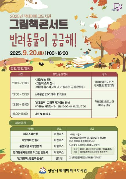 [세계로컬타임즈] 성남시는 오는 9월 20일 오전 11시~오후 4시 분당구 율동공원 내 책테마파크도서관에서 ‘반려동물이 궁금해!’ 주제로 한 그림책 콘서트를 연다.