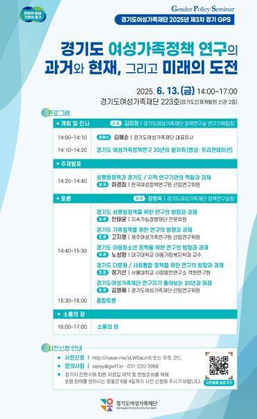 재단은 13일 오후 2시 재단 223호에서 ‘경기도 여성가족정책 연구의 과거와 현재, 그리고 미래의 도전’을 주제로 제3차 경기 GPS(Gender Policy Seminar)를 개최한다.