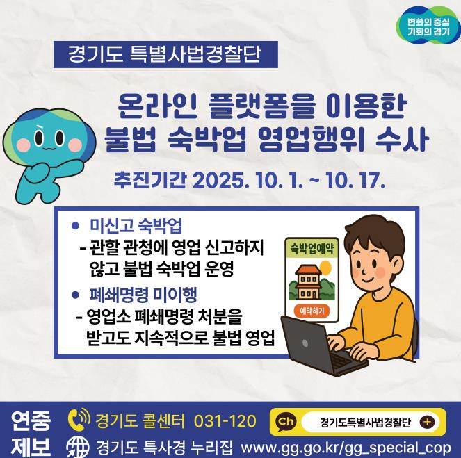 기이도 경기도 특별사법경찰단장은 “불법 숙박업소는 이용객의 생명을 담보로 불법 영업을 하는 만큼 이번 단속을 통해 불법 행위를 뿌리 뽑고 안전한 숙박 문화를 조성할 예정이다. 불법행위는 단호하게, 도민의 안전 앞에선 한 치도 물러서지 않겠다”고 말했다.