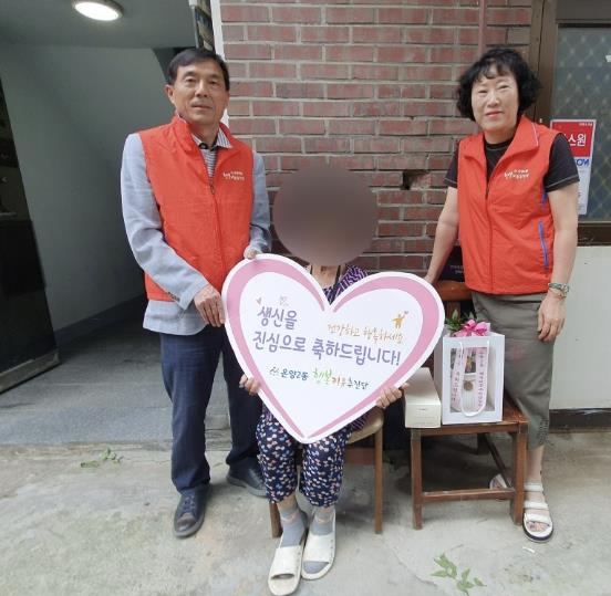 이 사업은 매월 생일을 맞은 독거노인 3가정을 직접 방문해 따뜻한 축하 인사와 함께 행복키움 협약업체 후원품을 전달하는 사업으로 ▲파리바게뜨 아산용화동점 ▲나눔플라워가 동참하고 있다.